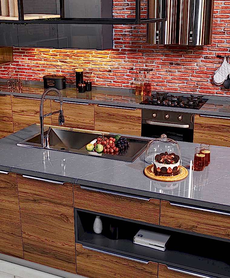 While providing great convenience in the kitchen with its island countertop and large sink, you can feel comfort and elegance together with ergonomic cabinets as well as showcases that you can decorate as you wish.