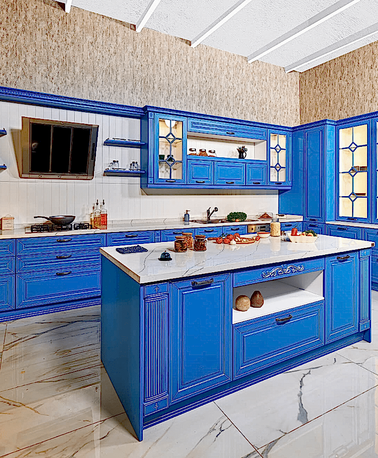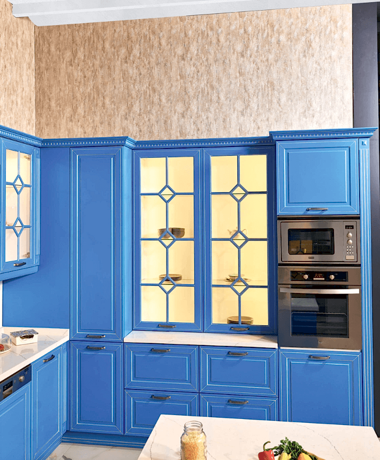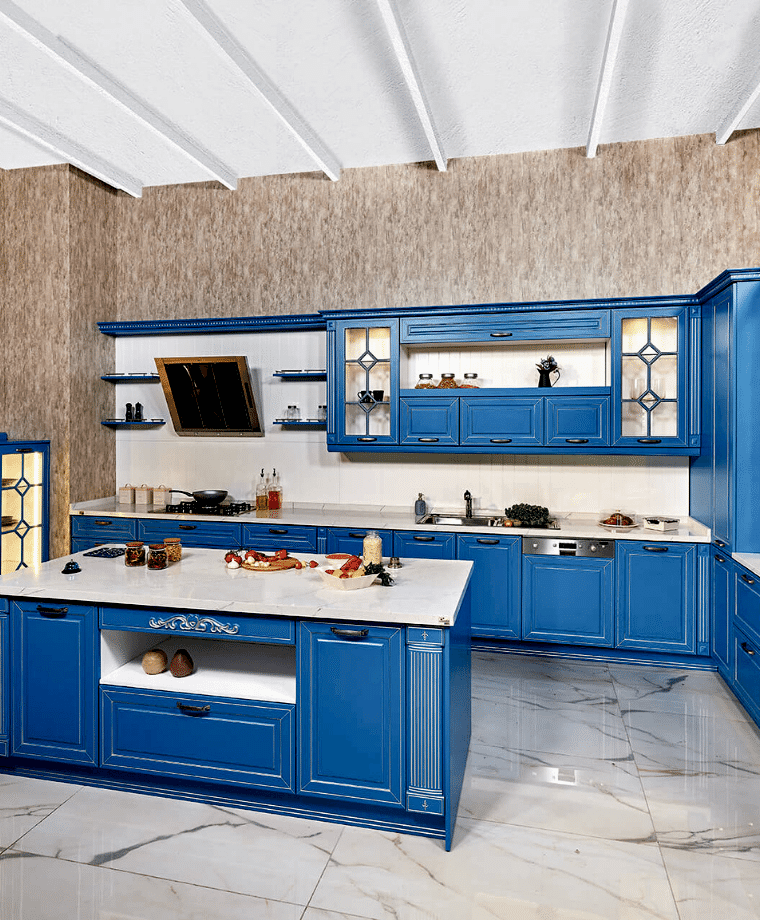 Klasik tarzı ve cam rafları ile Marine, mutfağına renk katmak isteyenler için ideal bir seçim.